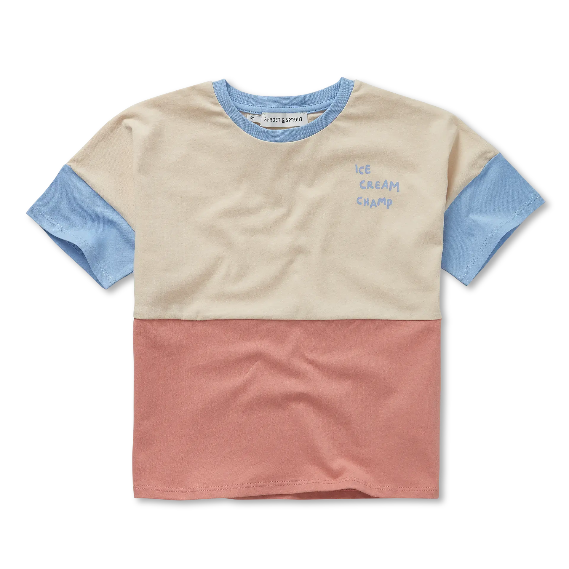 Juego, set, partido. Esta camiseta color color sésamo combina tonos atrevidos de sésamo, azul y rosa Dawn para un toque deportivo. Con un pequeño detalle de «Ice Cream Champ» en el pecho, es el compañero perfecto para jugar en verano. Elaborado con algodón 100% orgánico y disponible en tallas 4 y 6 años.