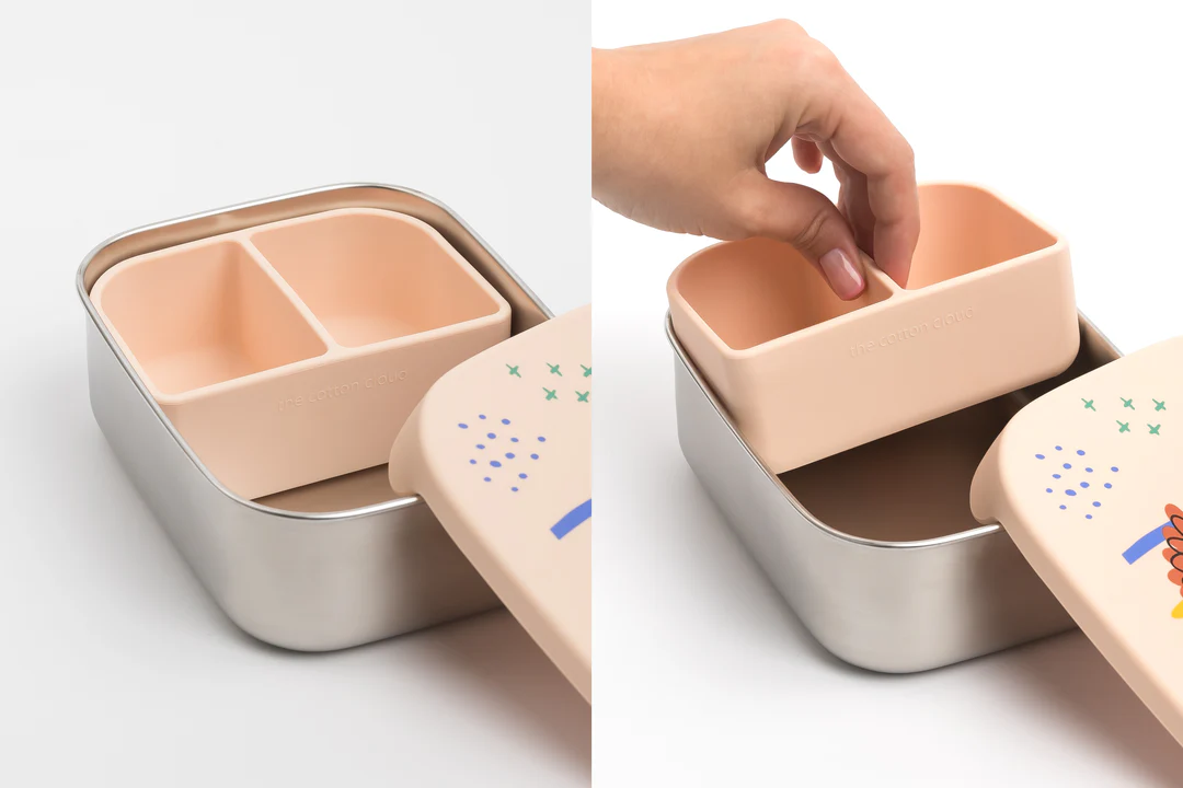 Esta alta calidad caja de almuerzo combina las ventajas de Silicona certificada por LFGB y Acero inoxidable 304 robustoProporcionar una solución duradera y segura para el almacenamiento de comidas de los niños. Tiene compartimentos extraíbles para máxima flexibilidad. Perfecto para jardín de infantes, escuela, picnics y almacenamiento de alimentos.