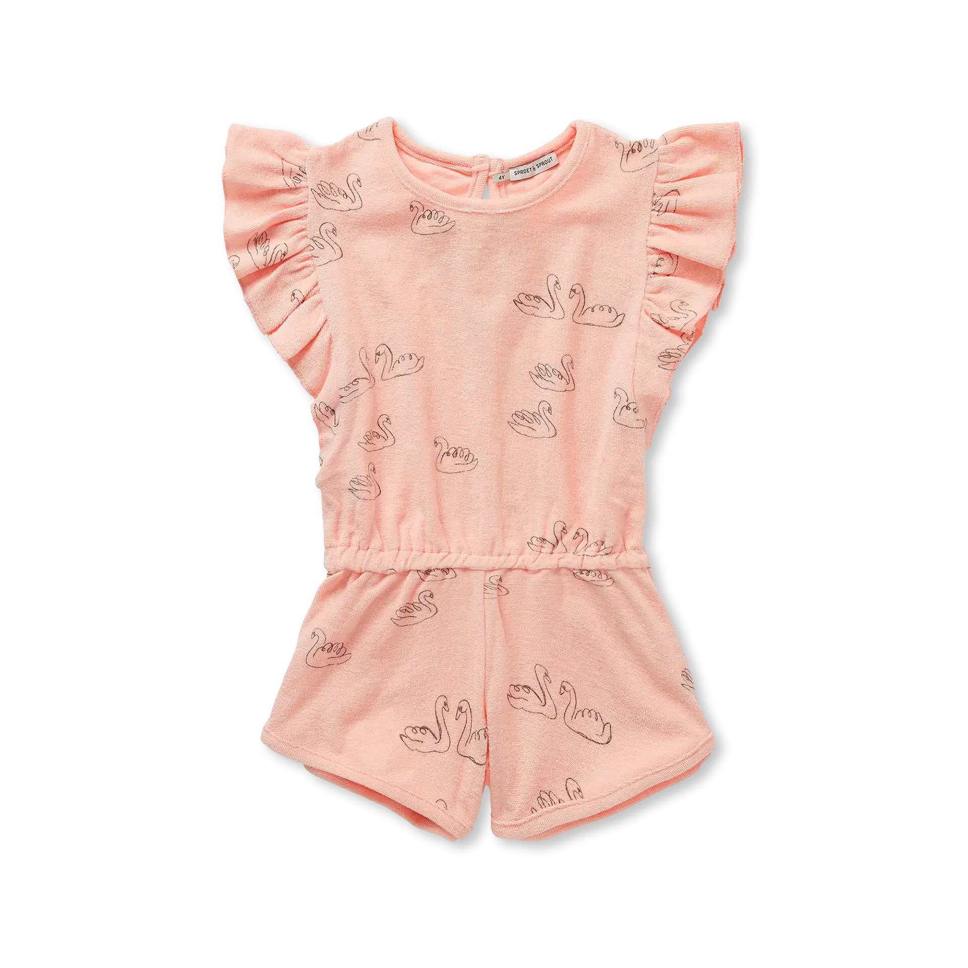Un mono perfecto para las más coquetas. Diseñado para pequeñas soñadoras que saltan como bailarinas y se deslizan como cisnes, combina suaves tonos ruborizados con delicados amigos emplumados.