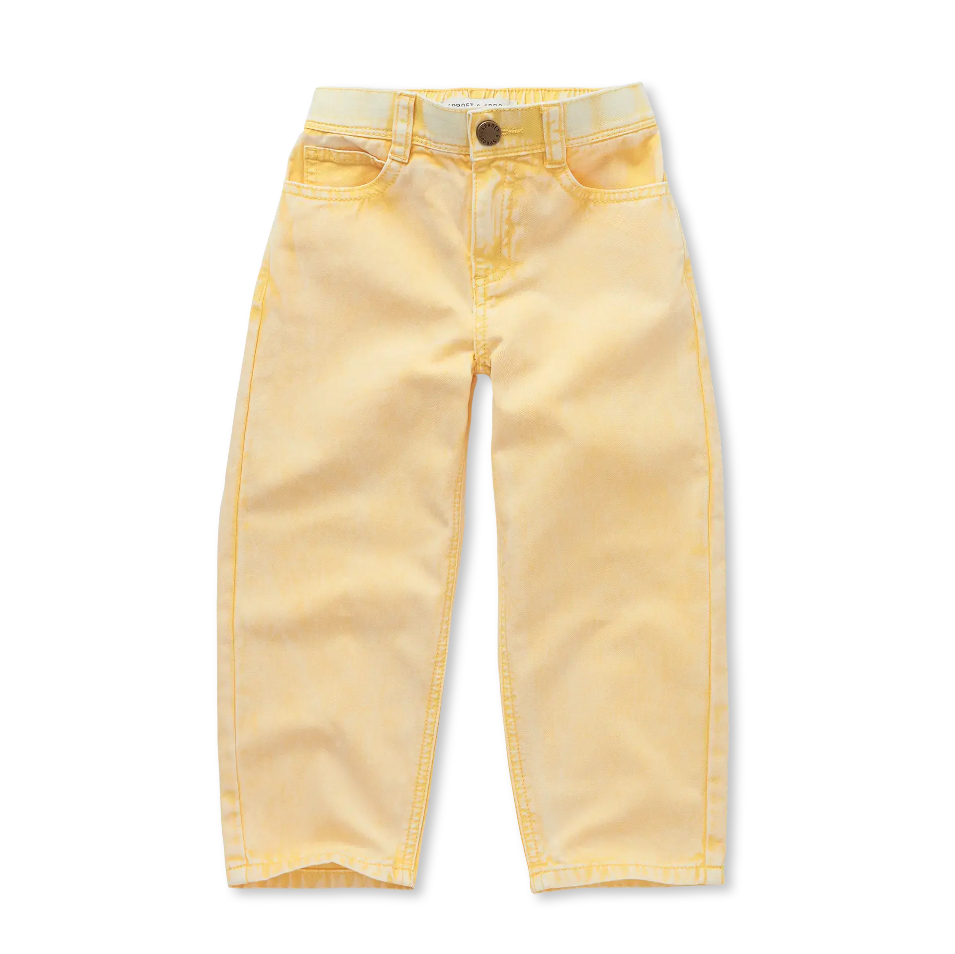 Los días soleados requieren vaqueros con un toque especial. Estos pantalones amarillo pastel añaden un toque fresco a cualquier conjunto. Con un ajuste relajado y calidad de denim suave, son perfectos para jugar, correr y marcar goles. Los vaqueros llevan una cinta ajustable dentro de la cintura, que ofrece un ajuste personalizado a medida que tu hijo crece.
