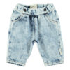 Pantalones de mezclilla con tirantes ajustables. Detallados con un logo burdeos bordado en el bolsillo trasero. Las tallas para bebés tienen cierres a presión entre las piernas.