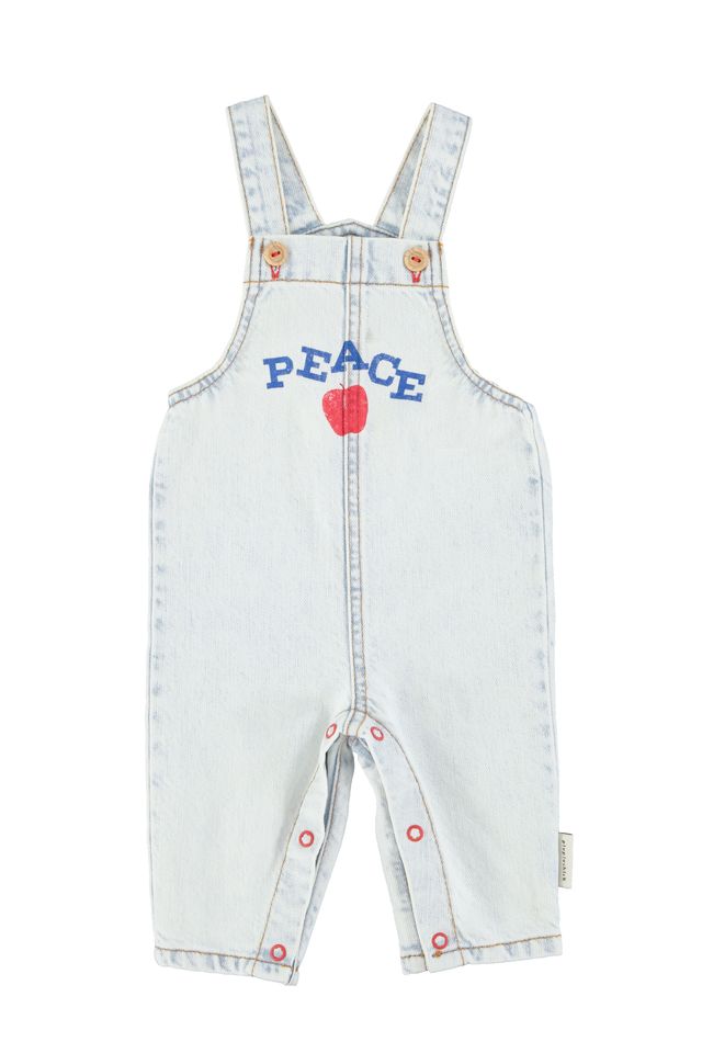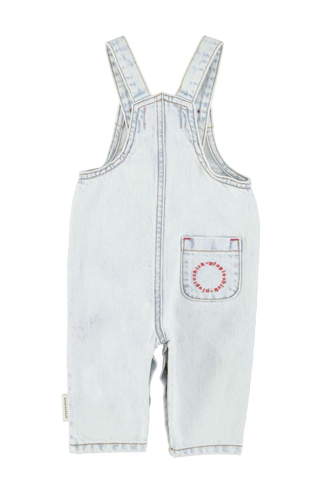 Peto para bebé con broches de presión en la entrepierna para abrir fácilmente. Tirantes ajustables con botones de madera. Detallado con estampado frontal y bordado de logo rojo en el bolsillo trasero.