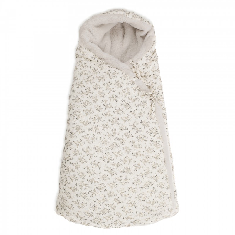 Se cierra mediante los lacitos de lino laterales. La parte inferior del saco se puede abrir con cremallera para que puedas introducir al bebé más cómodamente. Exterior en gasa de algodón orgánico estampada. Interior en tejido polar beige ultra-suave. la base del saco tiene aperturas para que lo puedas colocar en sillitas de grupo 0.
